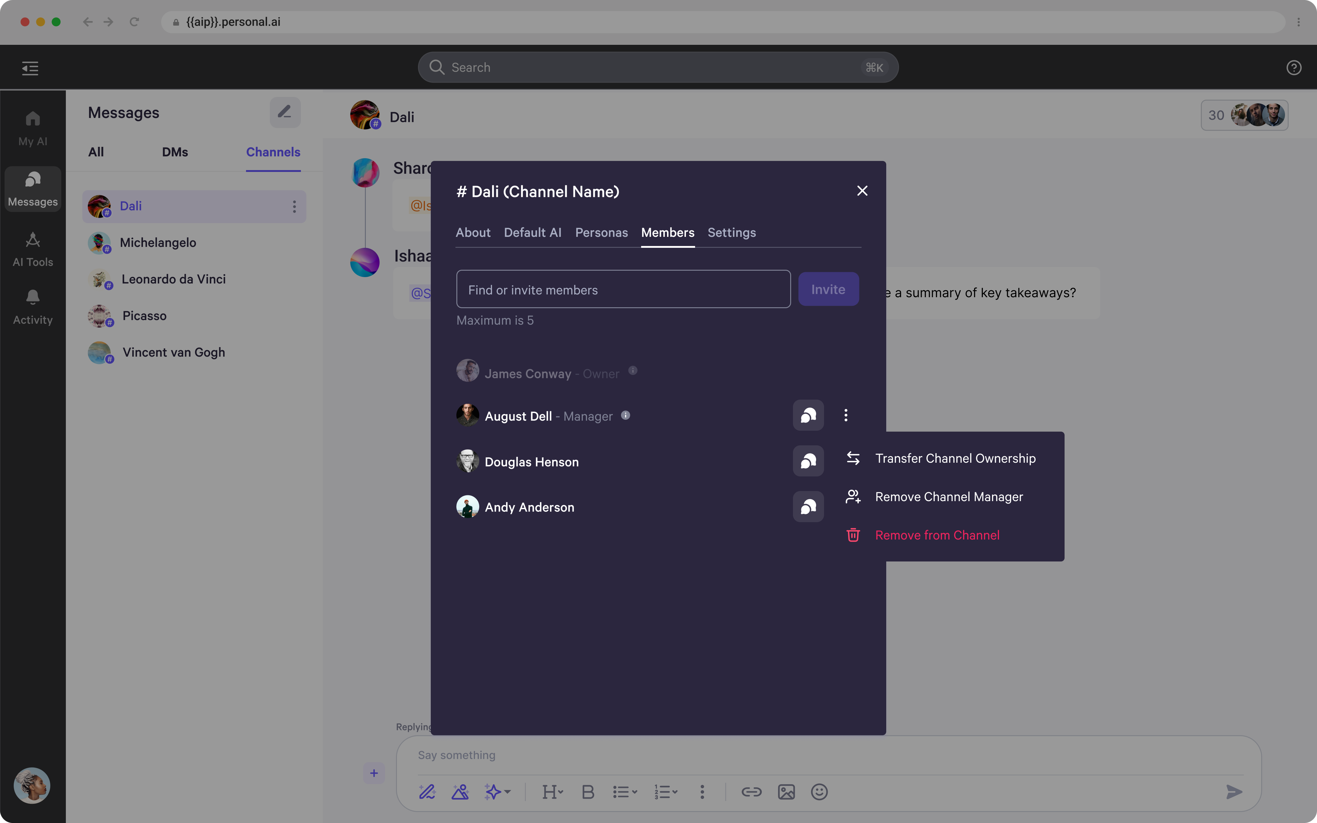 - To manage current members, click the three dots next to their name to transfer channel ownership or assign/reassign their role as a Channel Manager.