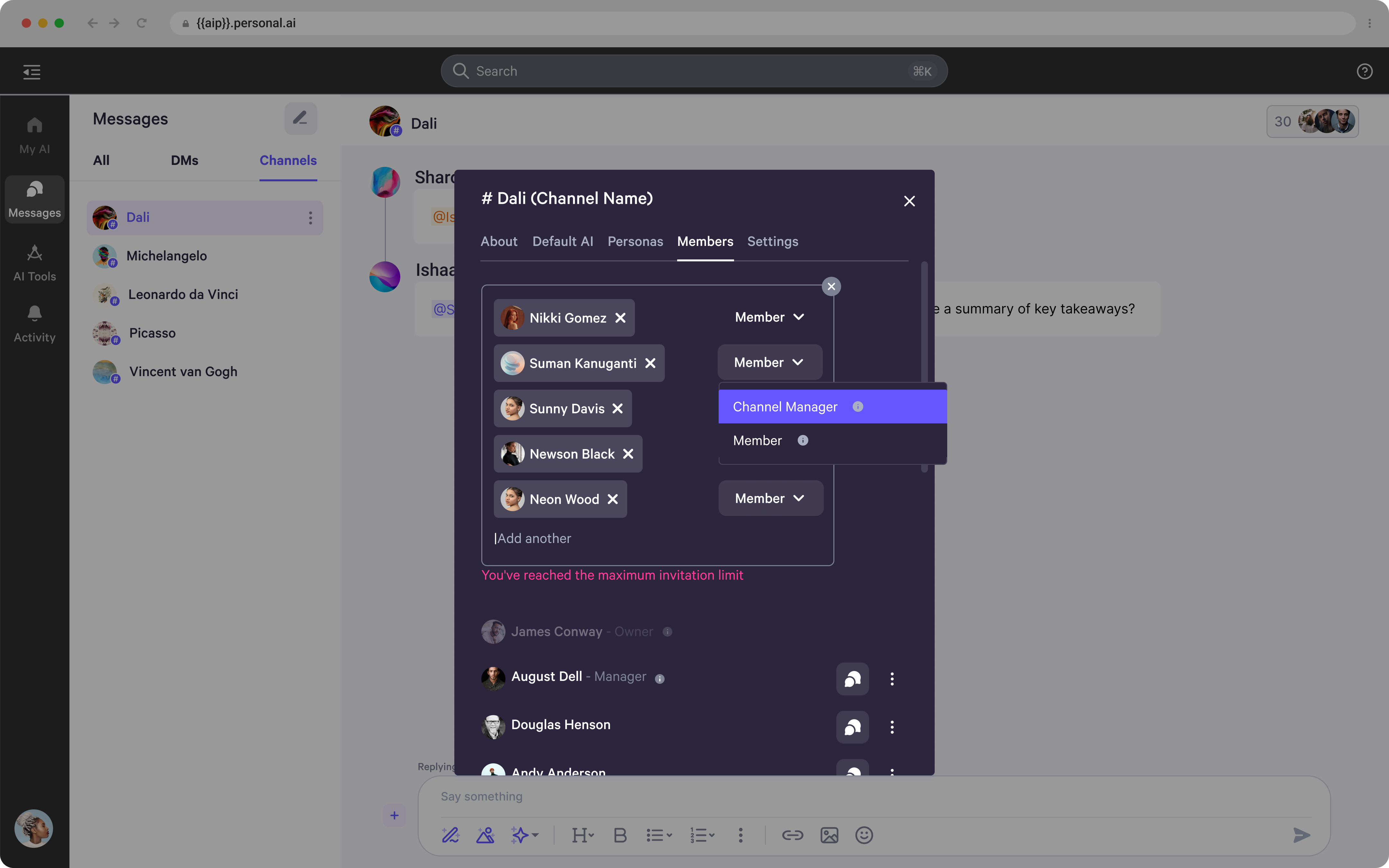 - When inviting new members, you can assign roles such as Channel Manager or Member. Hover over the “i” symbol to view more details about each role and its permissions.